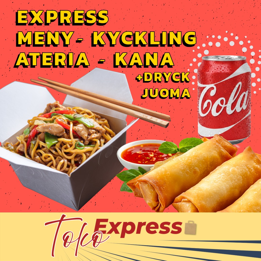 Stir-fried noodles with chicken, a drink, spring rolls and sweet chili dip. Fast, tasty and ready for takeaway.
